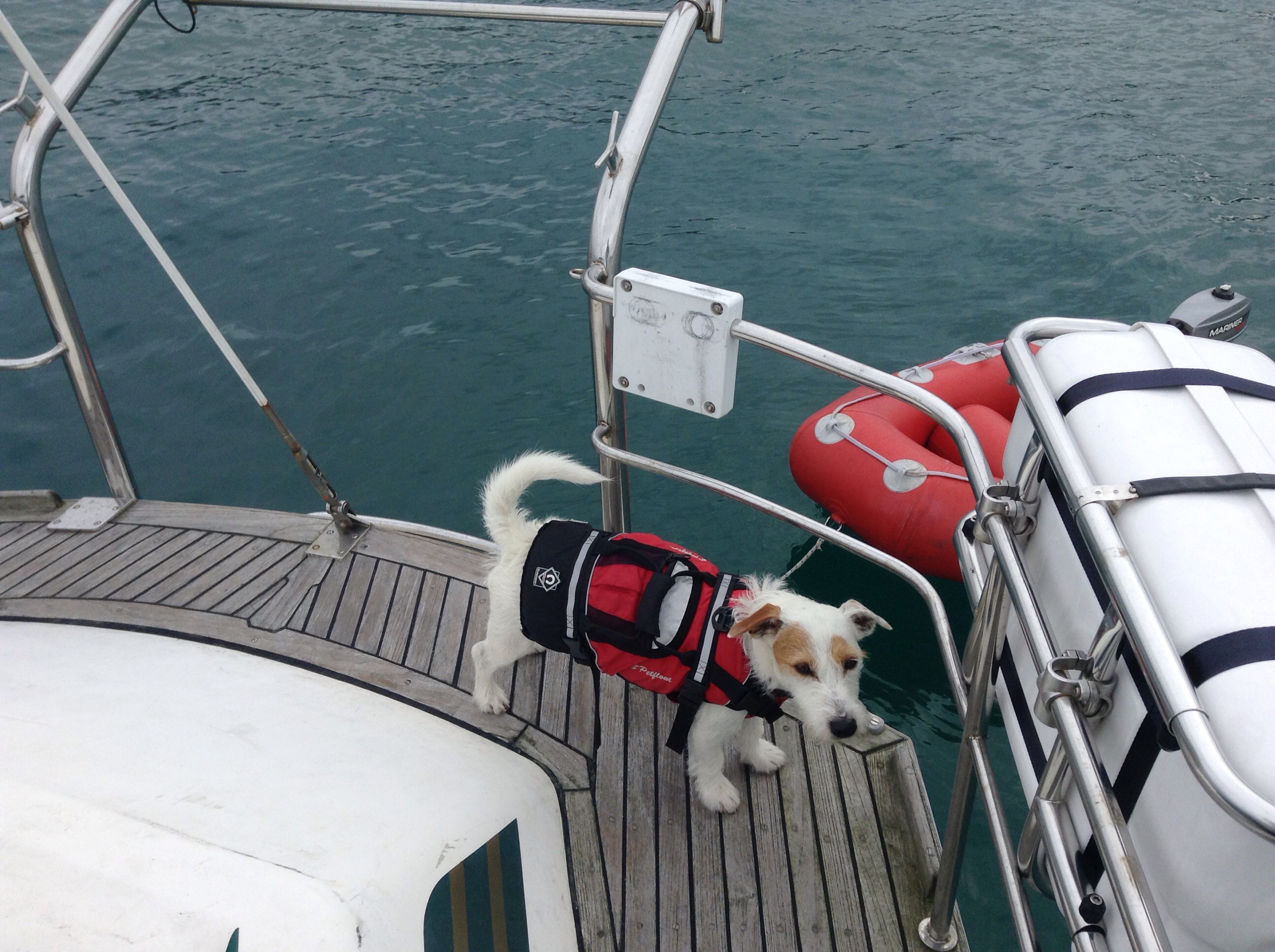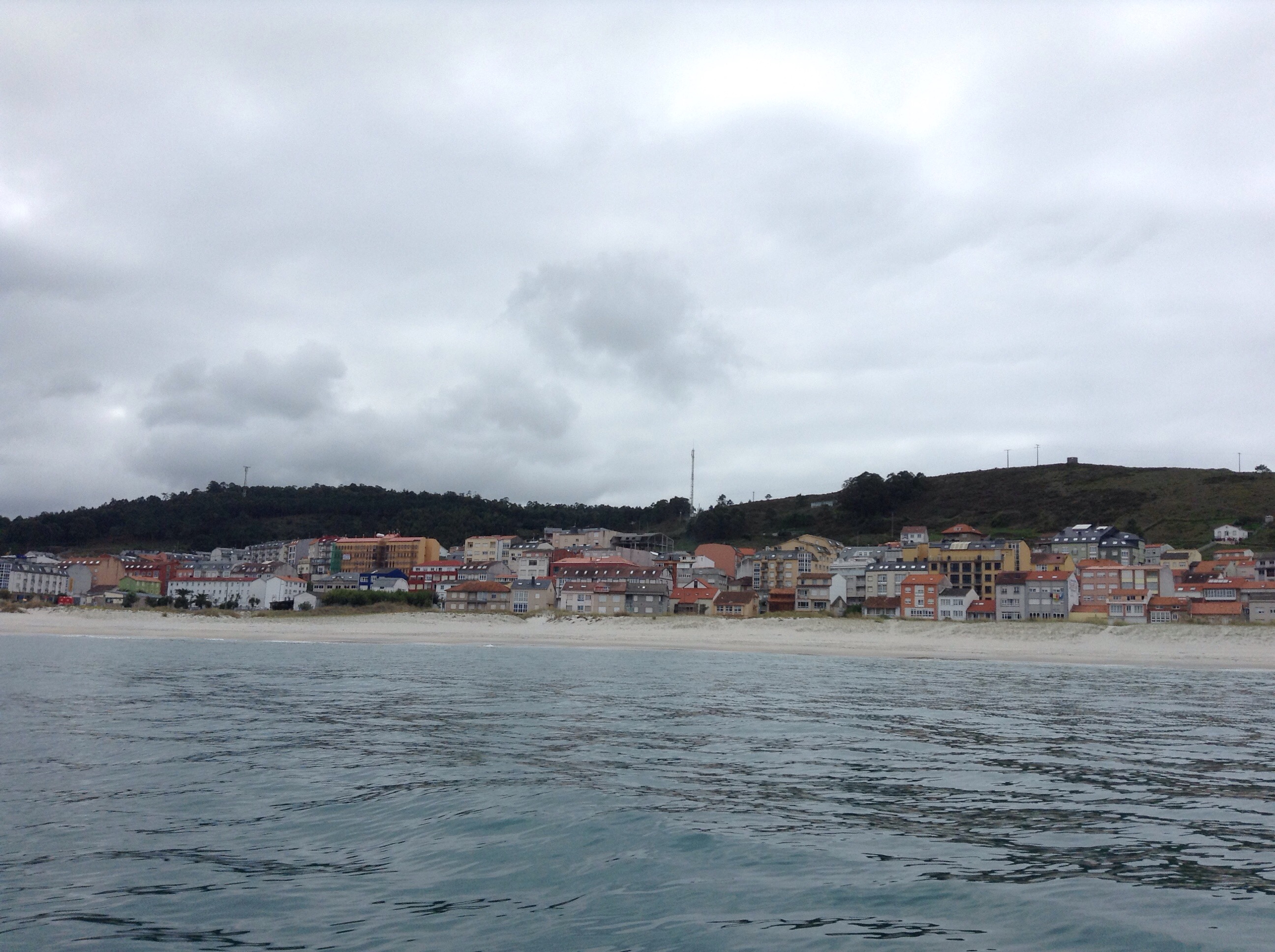 We sailed about half way but again the wind was playing up, one minute it was there next minute it was gone so we motored the second half. We arrived a Laxe a little anchorage with a long stretch of white sandy beach & a long line of multicoloured littles houses & buildings behind the beach leading up into the hills. It looked lush & the water was lovely and clear, Scrump Doggy Dog must have been impressed because as soon as he spotted the beach he started squeaking by the swim platform, which is now the boat alternative to whinging at the front door to go out!