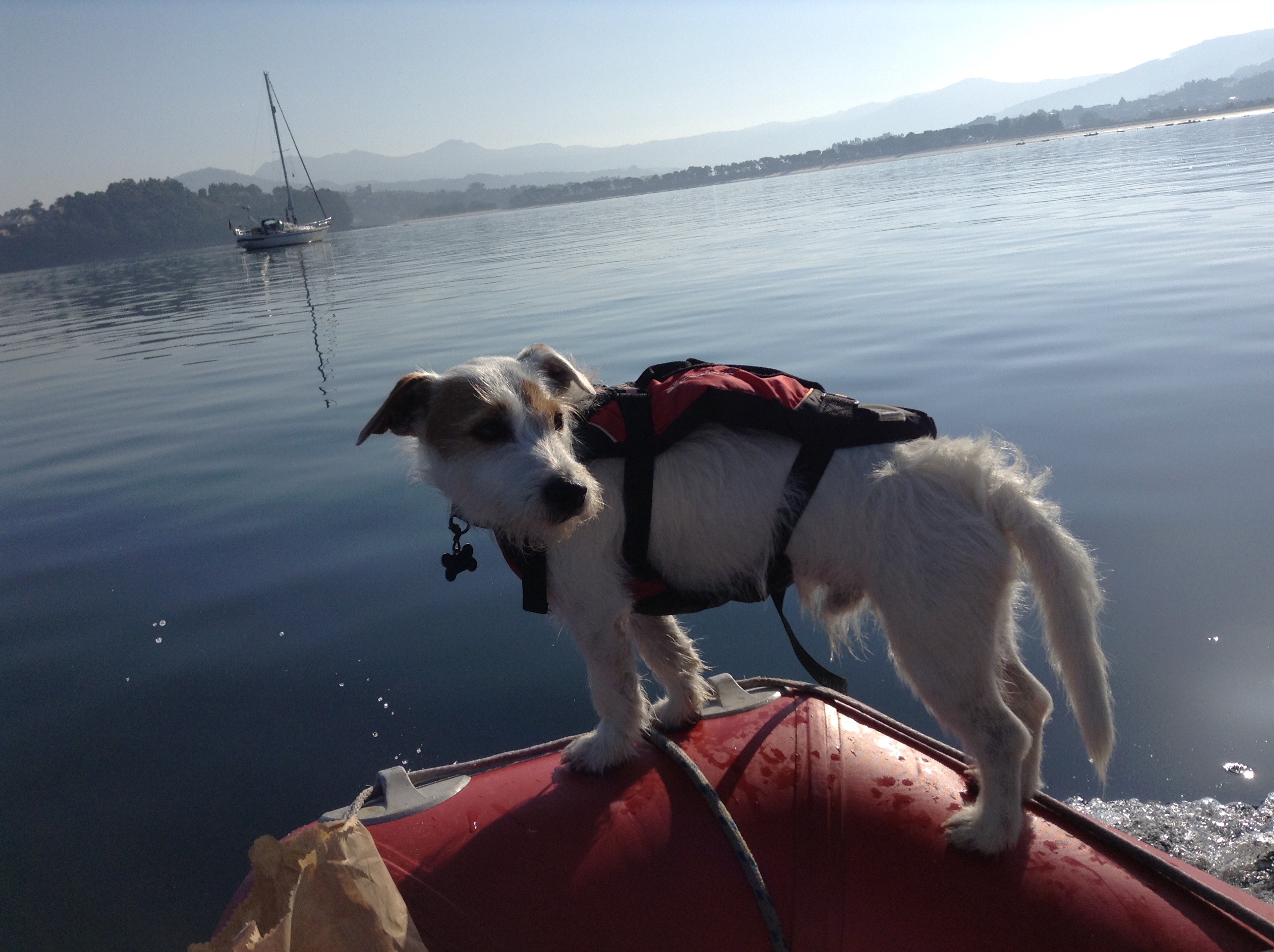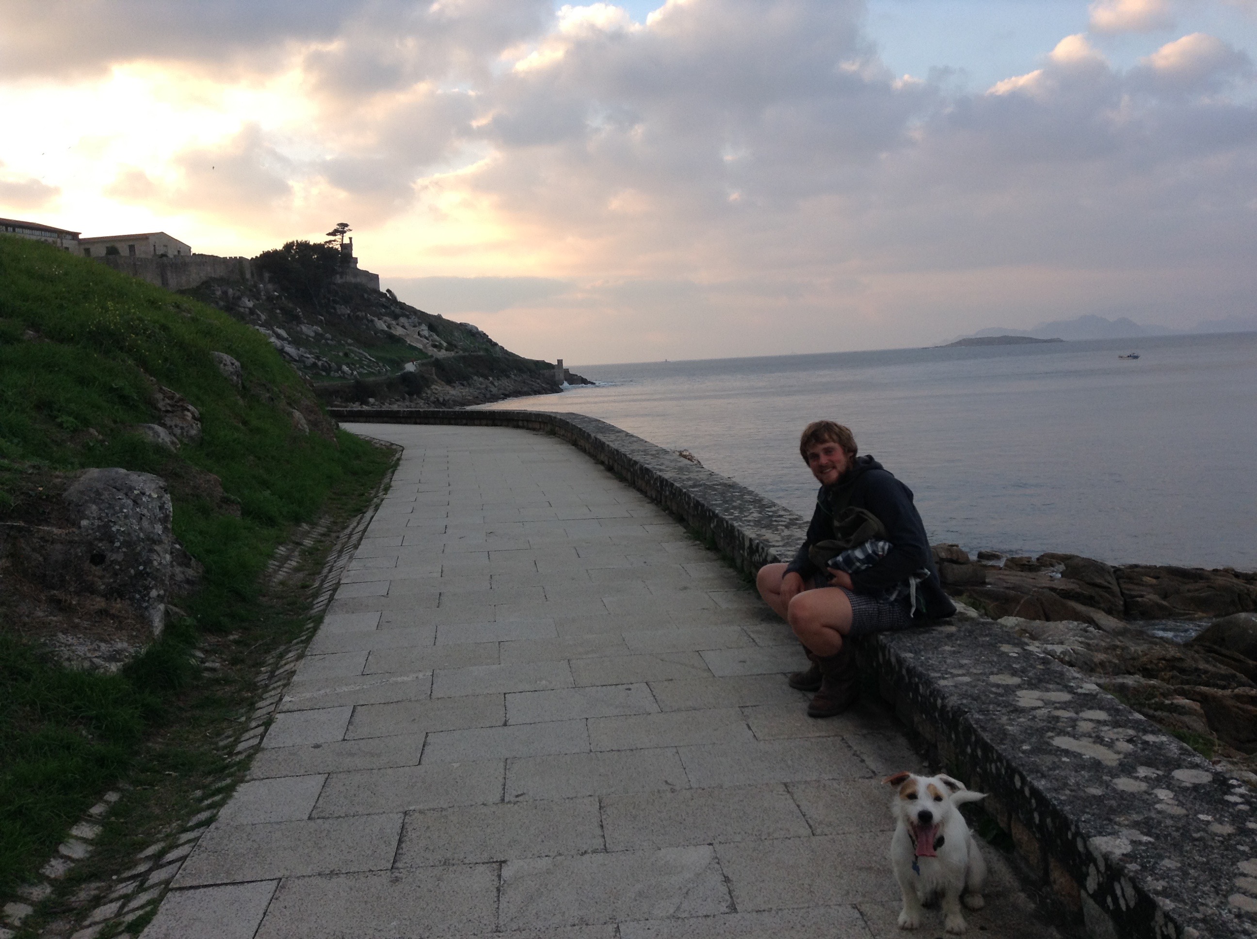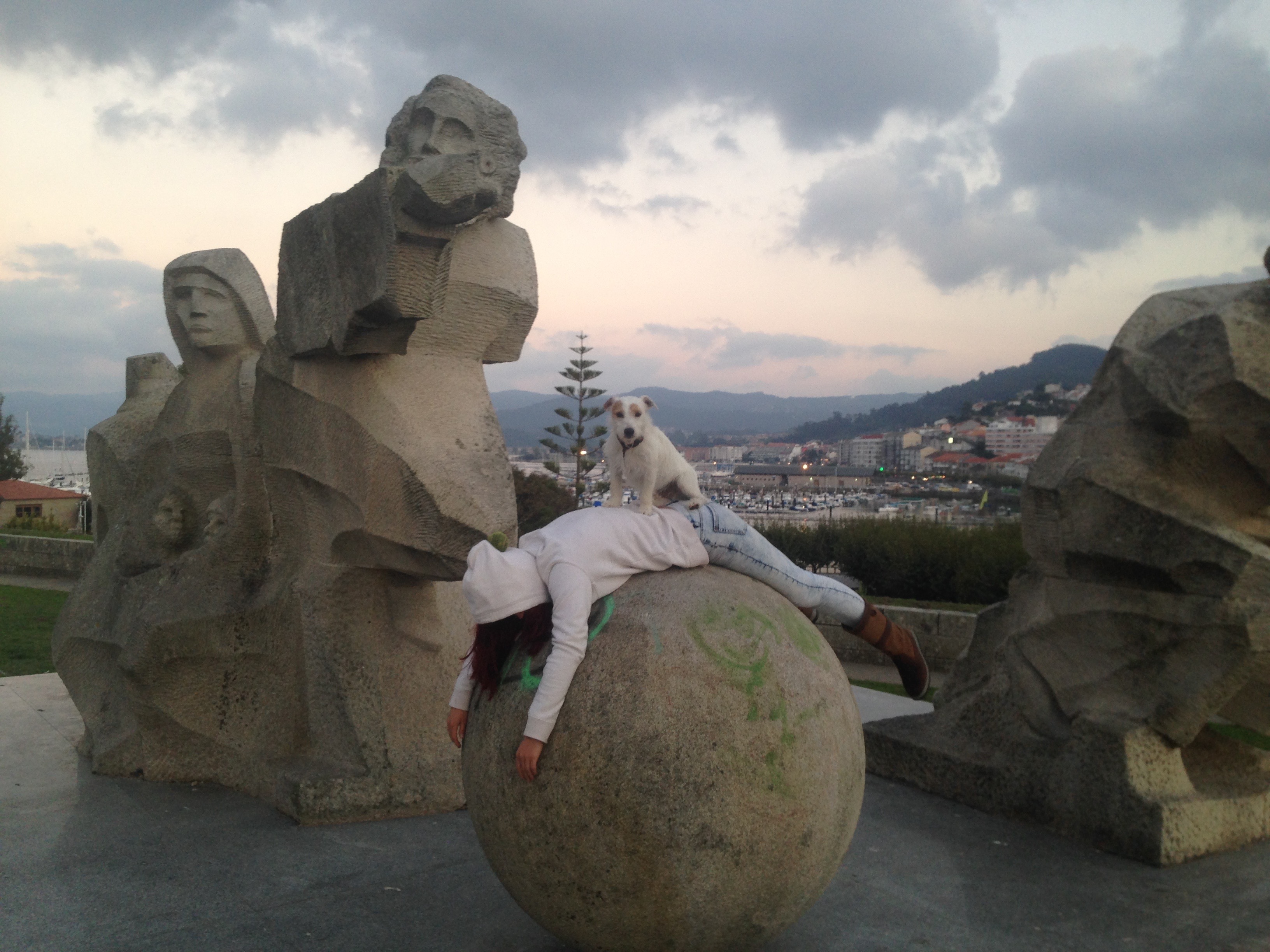On firing up the engine for the first time since the repair it was great to see that the hole was repaired, it wasn’t so great to feel a second smaller hole pumping out exhaust fumes. It wasn’t a lot and we decided we needed to push on. We had a 45 mile sail down to Bayona, this would be our last stop in Spain, and we were both looking forward to getting into Portugal, which was 15 miles south. On arriving we contacted the Marina to arrange our mooring for the night, they kindly came to greet us on the pontoon, on rounding the breakwater we saw a lovely, comfortable, FREE anchorage, so cancelled the Marina over the radio, much to their annoyance. Unfortunately with a weedy sea bed we struggled to get the anchor dug in the first 4 attempts, but we refused to crawl back to the marina with our tail between our legs, luckily we got firmly anchored in on the 5th attempt. We tendered ashore to take Scrumpy for a walk. For once it was not the usual monotonous walk, but we found a lovely old castle to stroll around and it had the most amazing views of the sky and sea this was a nice change of pace. We even played around with some giant Sculptures & got Scrump Dog Millionaire to practising his camera posing skills. The following morning we nipped ashore to get our Portuguese courtesy flag to fly once we crossed the border, and it was back to the boat to set sail from Spain.