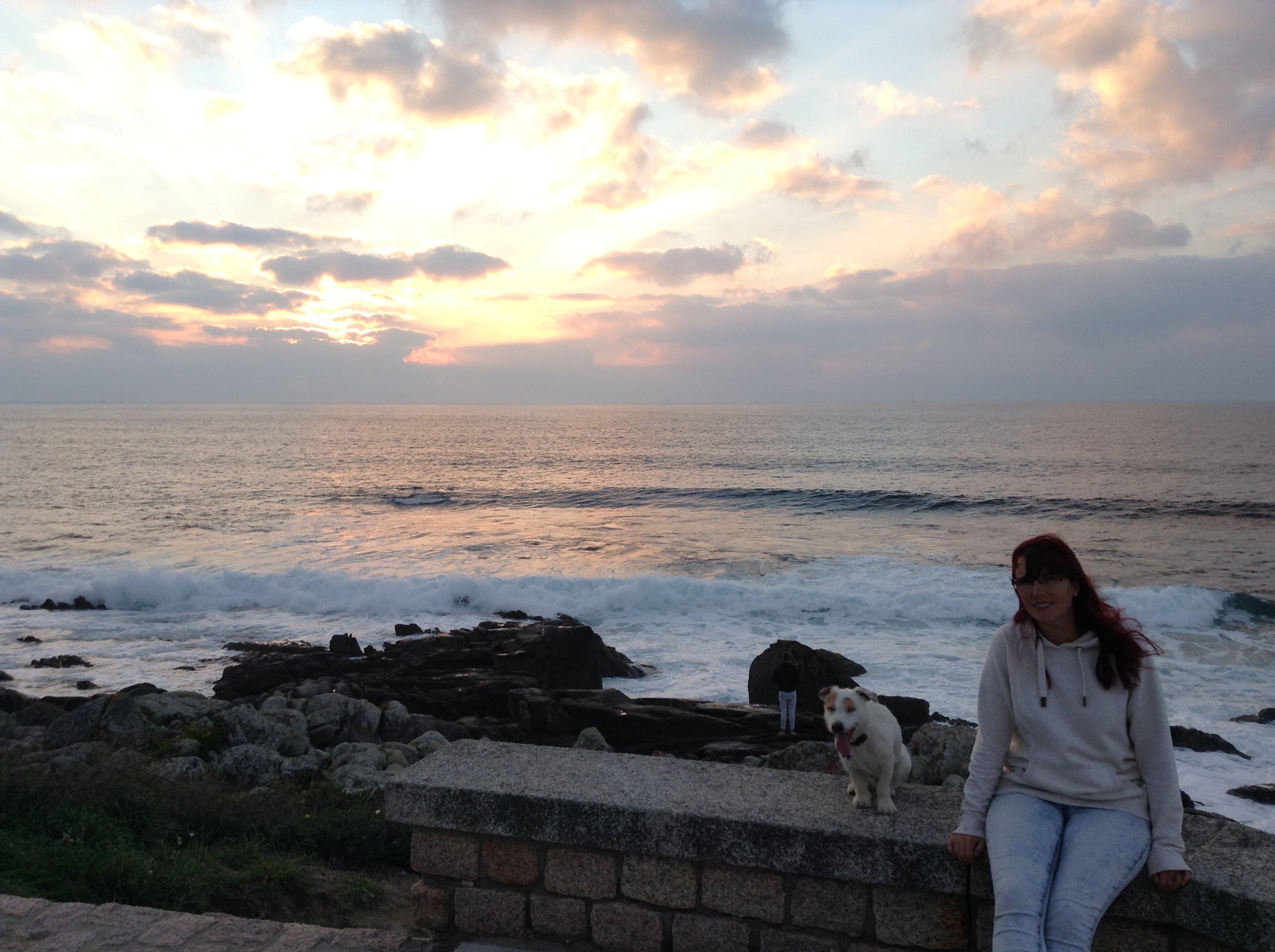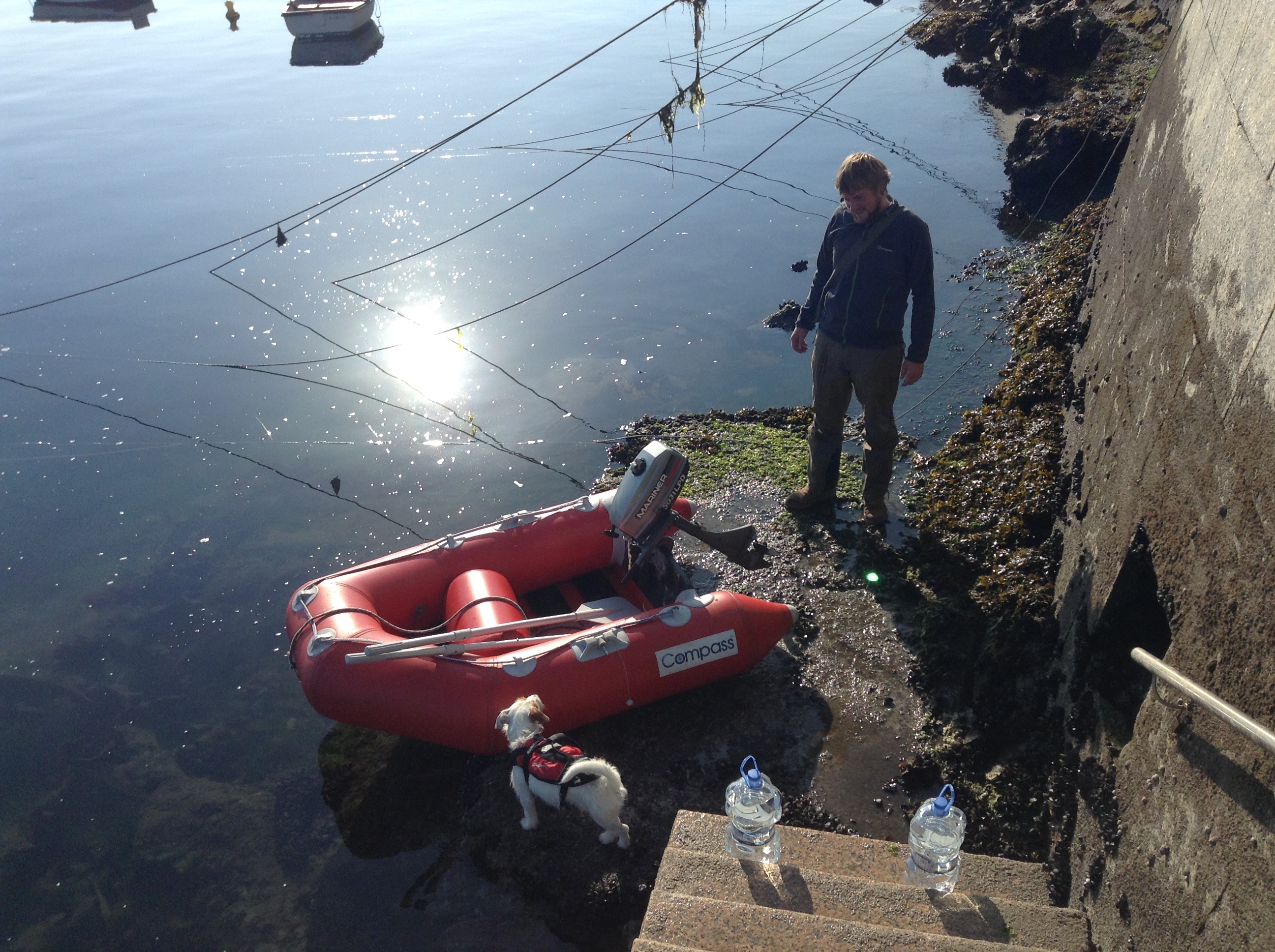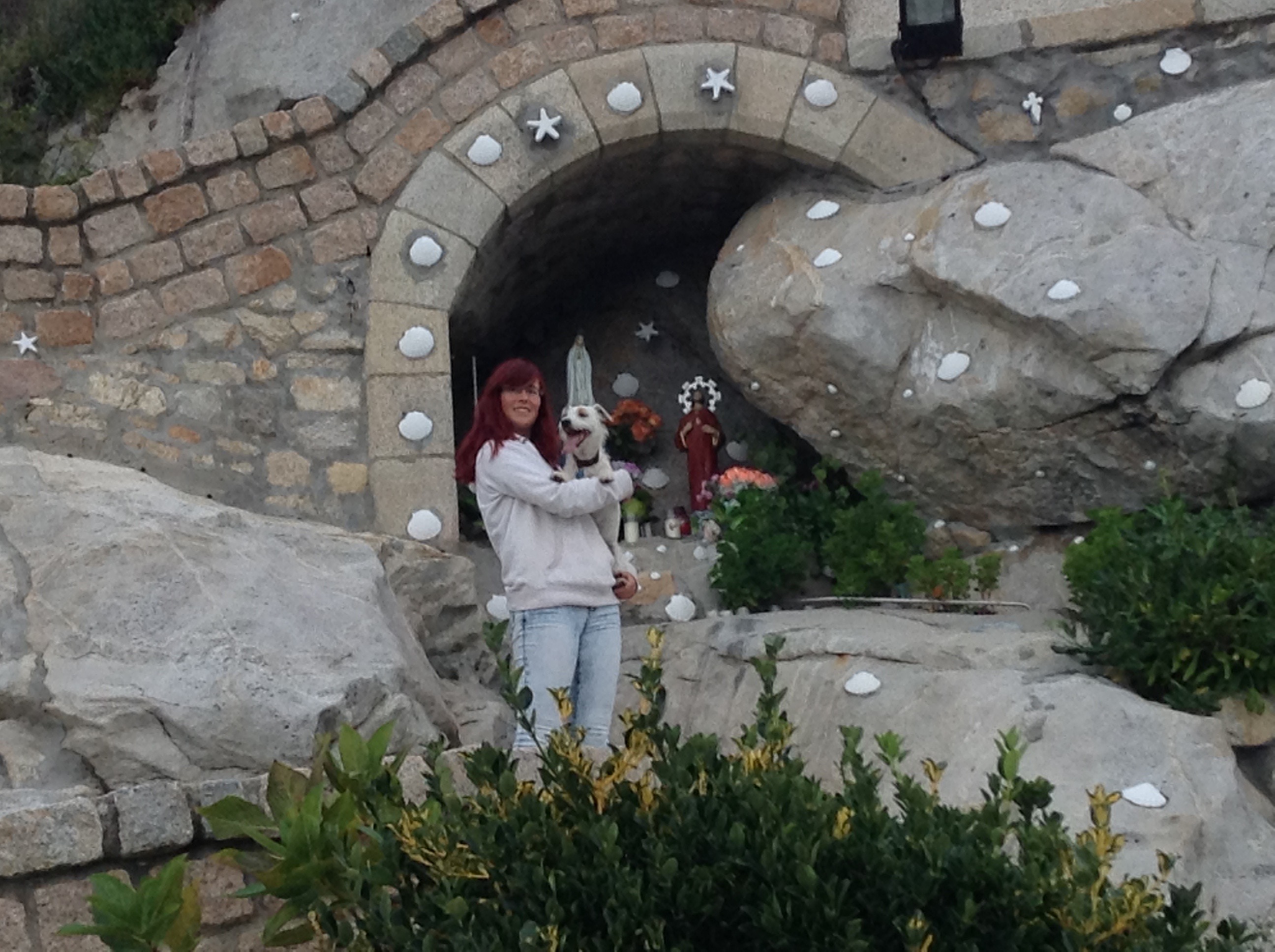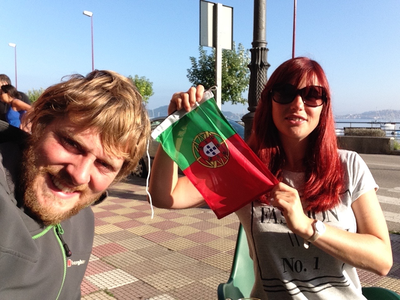 On firing up the engine for the first time since the repair it was great to see that the hole was repaired, it wasn’t so great to feel a second smaller hole pumping out exhaust fumes. It wasn’t a lot and we decided we needed to push on. We had a 45 mile sail down to Bayona, this would be our last stop in Spain, and we were both looking forward to getting into Portugal, which was 15 miles south. On arriving we contacted the Marina to arrange our mooring for the night, they kindly came to greet us on the pontoon, on rounding the breakwater we saw a lovely, comfortable, FREE anchorage, so cancelled the Marina over the radio, much to their annoyance. Unfortunately with a weedy sea bed we struggled to get the anchor dug in the first 4 attempts, but we refused to crawl back to the marina with our tail between our legs, luckily we got firmly anchored in on the 5th attempt. We tendered ashore to take Scrumpy for a walk. For once it was not the usual monotonous walk, but we found a lovely old castle to stroll around and it had the most amazing views of the sky and sea this was a nice change of pace. We even played around with some giant Sculptures & got Scrump Dog Millionaire to practising his camera posing skills. The following morning we nipped ashore to get our Portuguese courtesy flag to fly once we crossed the border, and it was back to the boat to set sail from Spain.