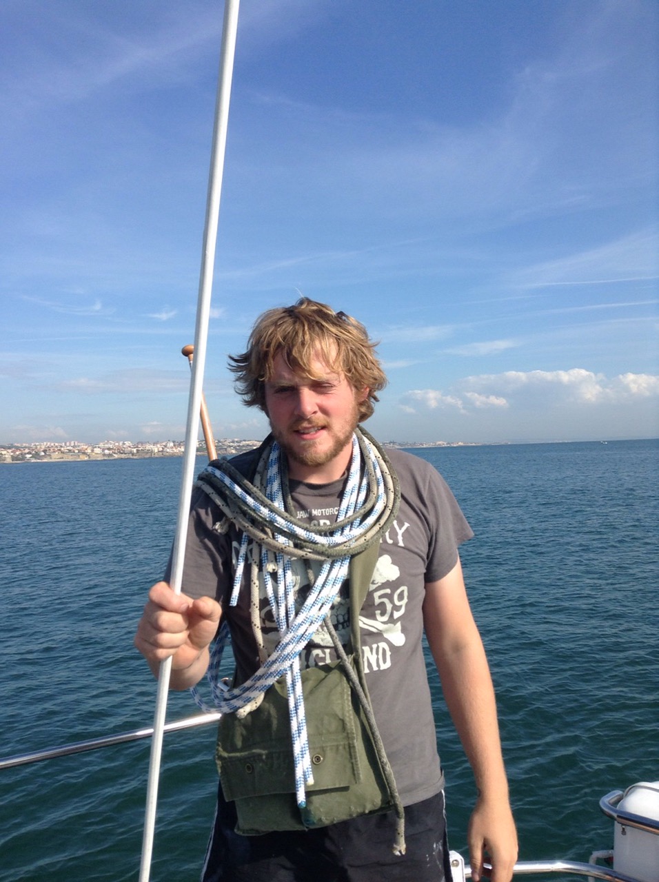 Below: Simon is the picture of safety with ropes hanging around his neck after going ashore in the dingy to the chandlery for some new rigging!